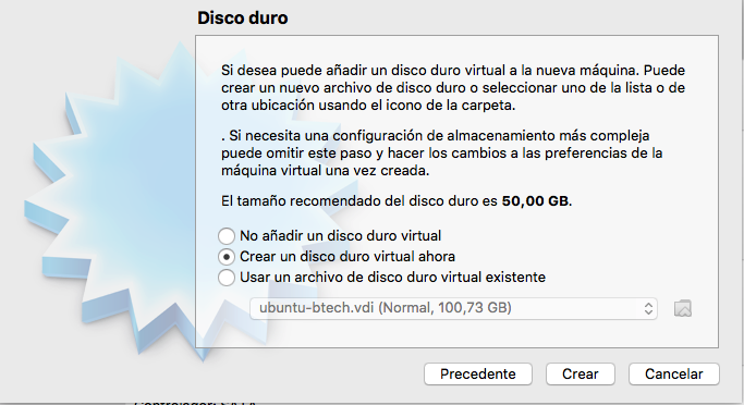 Pulsamos en siguiente, ahora nos toca configurar el disco duro , seleccionamos Crear un disco duro virtual ahora y pulsamos en crear