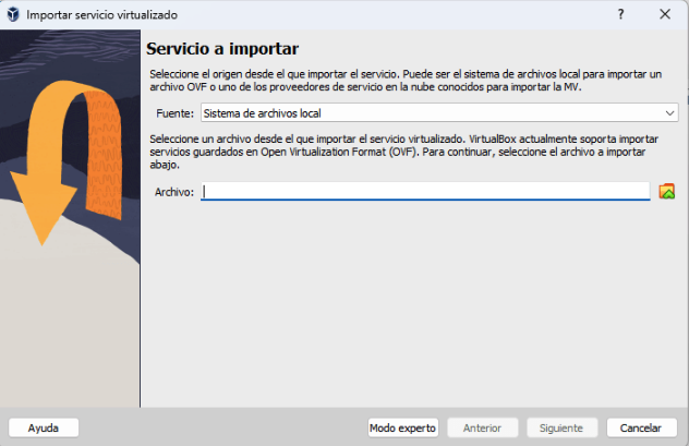 Se abre el asistente para la importacion, donde tenemos que indicar donde esta el archivo OVA que has descargado y luego pulsamos siguiente verificando la configuración y en Terminar