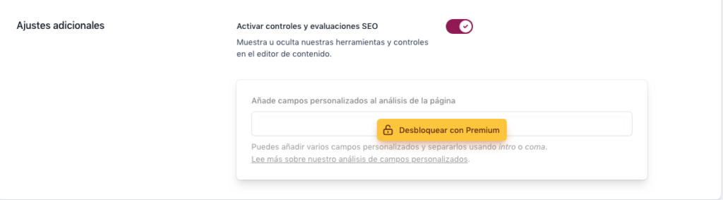 5- Ajustes adicionales que en la version gratis solo nos deja activar controles y evaluaciones SEO